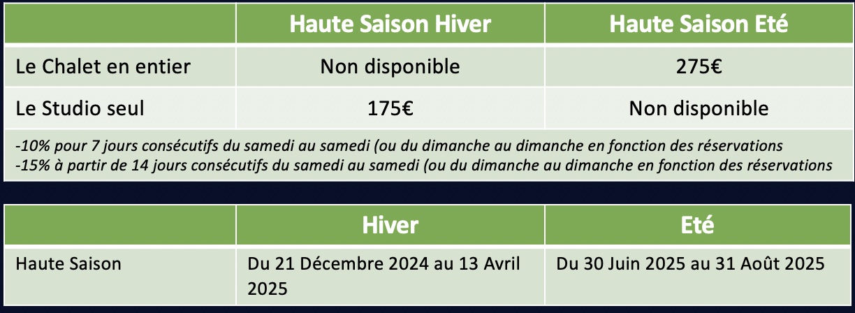 Prix par jour pour maximum 8 personnes pour le chalet l’été et pour 2 personnes pour le studio l’hiver